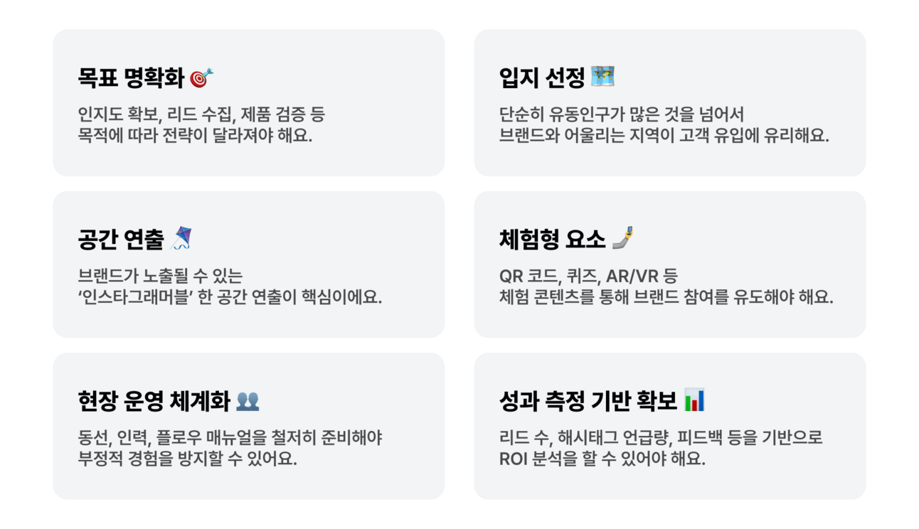 팝업스토어를 기획하기 이전에 명확히 해야 할 핵심 요소 6가지를 꼽으라면 다음과 같아요.